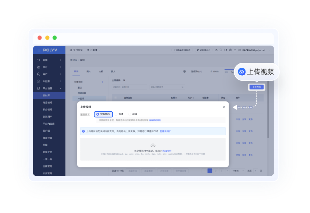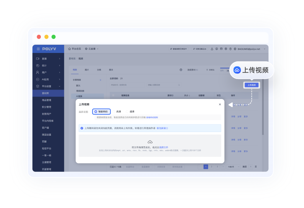 素材库视频上传,新增三种视频转码规则,可根据视频画质按需设置,满足不同场景视频使用要求。