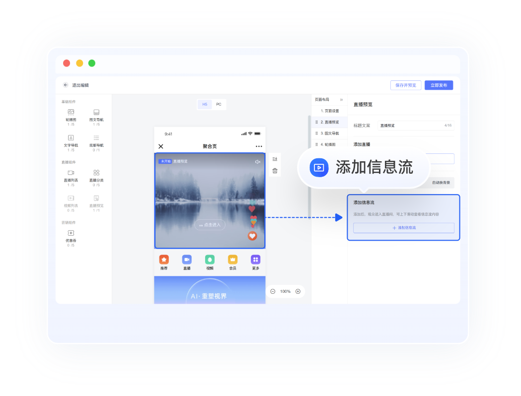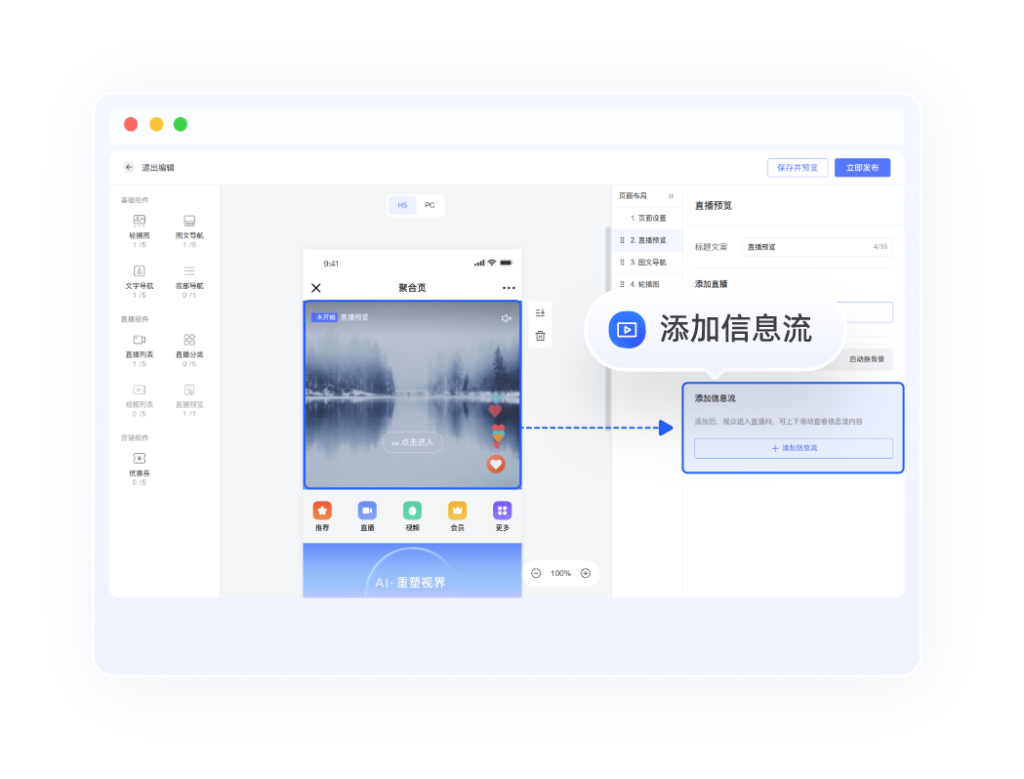 【聚合页-直播预览组件】支持添加信息流,从这一组件进入直播间后,观众可以上下滑动查看更多视频直播内容,沉浸式“刷”直播,从而提高其他直播频道/短视频的曝光。