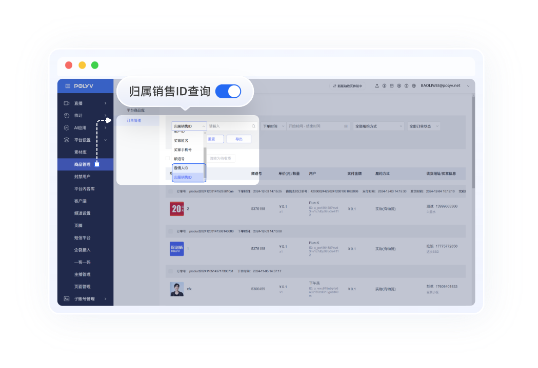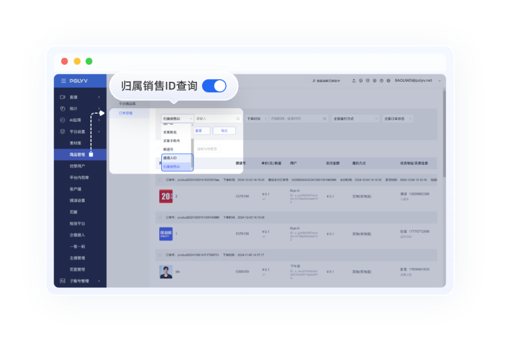 在商品管理-订单管理中新增「邀请人」、「归属销售」字段,使用该功能进行营销,可按照推广成果向推广者结算佣金,也能帮助销售团队精准统计业绩,让业务流程更高效。