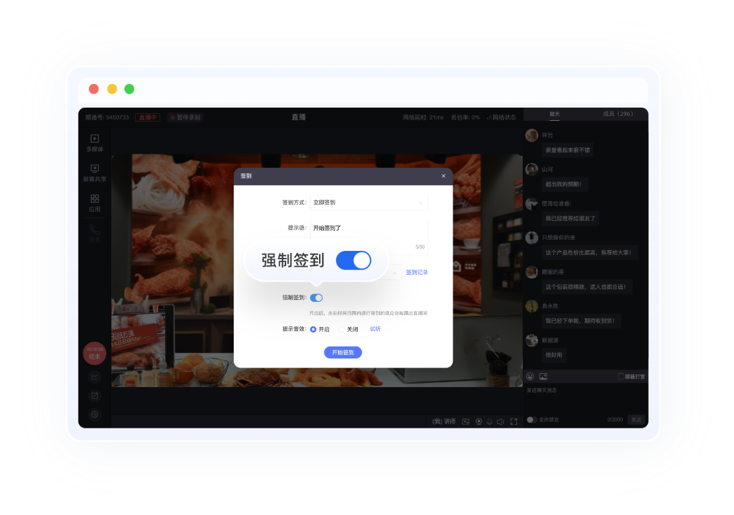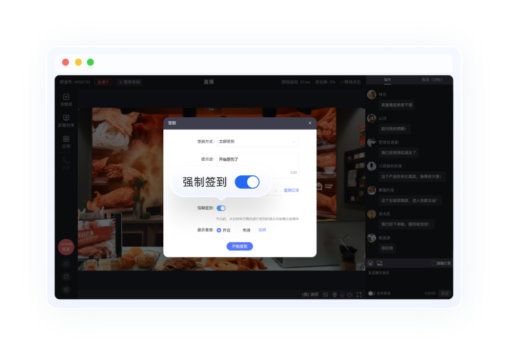 开播端开启【强制签到】开关后,观众未在规定时间内签到,会被强制退出直播间,有效避免观众挂机,提高用户转化。