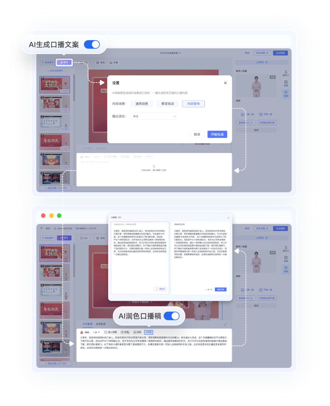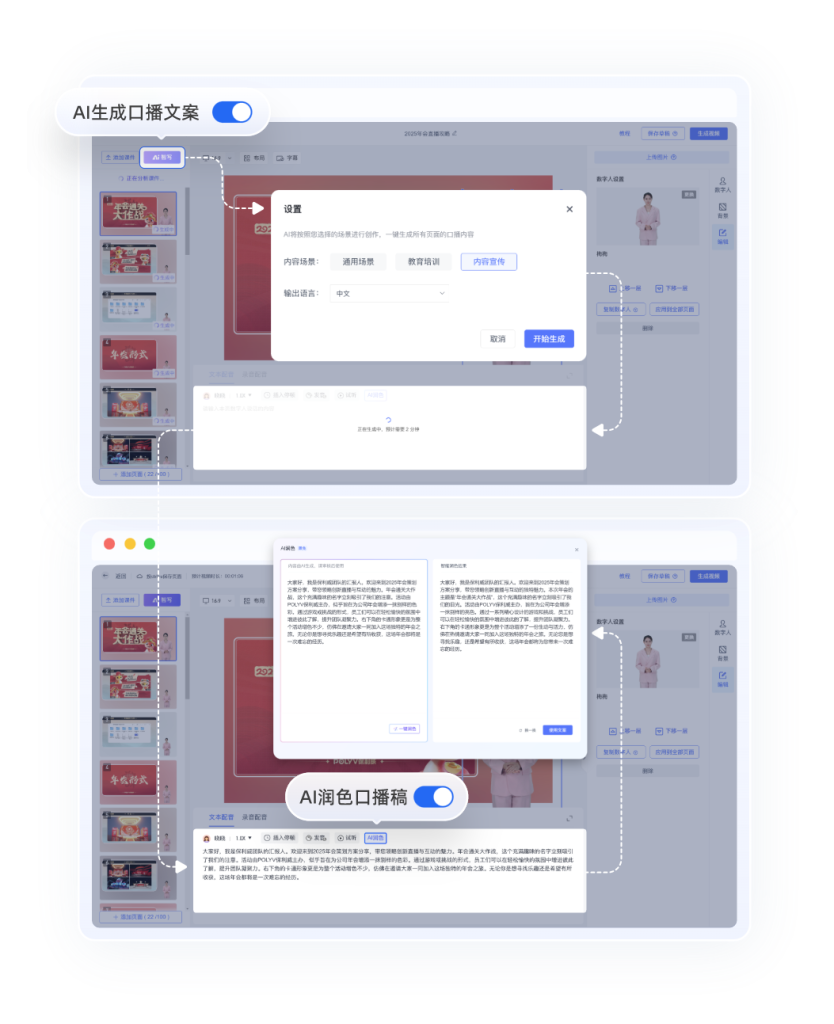 在视频创作中,提供AI智写功能,可识别“理解”PPT内容,一键生成口播稿文本,使用「AI润色」功能还可快速优化口播稿,提高视频制作效率。