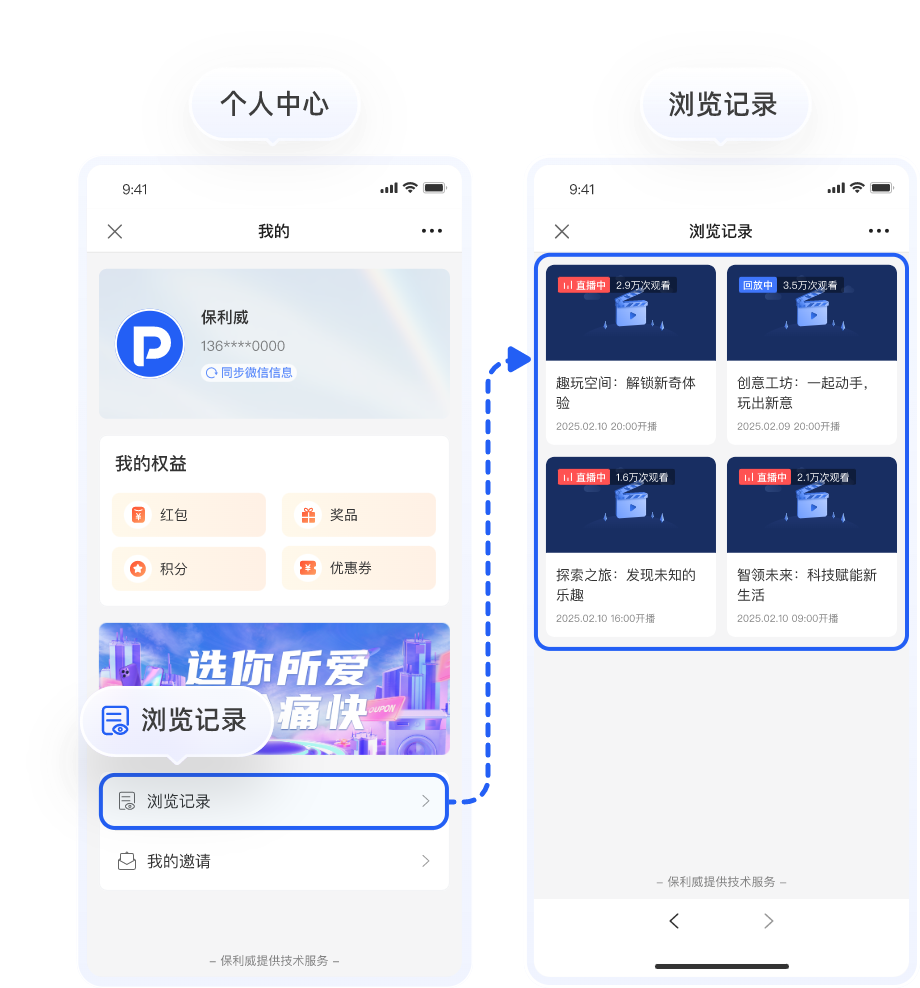 ·【个人中心页】新增浏览记录组件,配置后观众可查看浏览记录