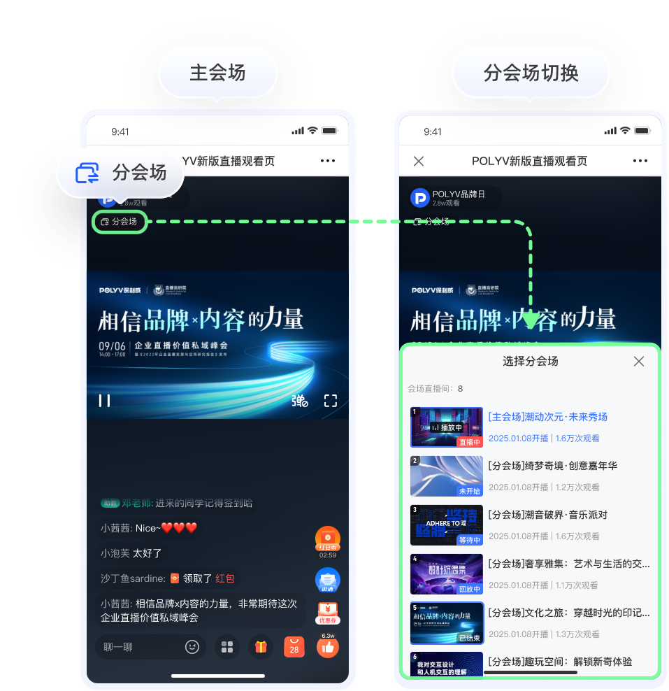 支持配置竖屏多会场直播。观看直播时,观看页左上角会显示【分会场】入口,观众可切换不同分会场直播间。