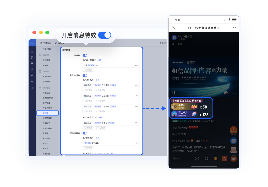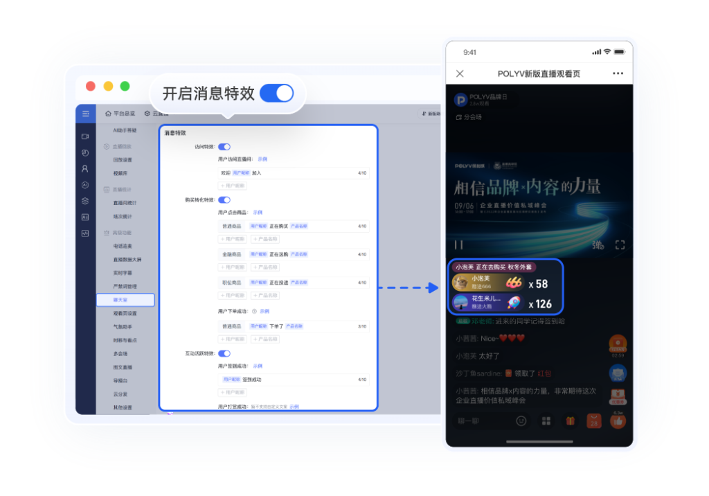 本月,保利威直播支持设置「消息特效」、支持自定义特效文案,竖屏直播支持多会场开播,此外,观众可在直播间中预约其他频道直播……下滑查看更多详情🔍