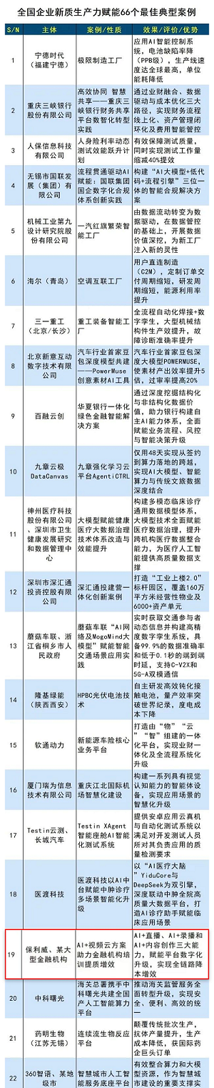 保利威为某大型金融机构提供AI+视频云方案,在AI+直播、AI+录播、AI+内容创作三大领域提供产品与技术服务,赋能该金融平台数字化升级实现全链路降本增效,为金融机构的稳健发展提供了强有力的技术支持。这一服务案例完美契合“技术突破性、模式创新性”标准,为各大金融机构树立了数字化转型的标杆,保利威凭借出色的技术创新和案例实践成功入选“全国企业新质生产力赋能最佳典型案例”。