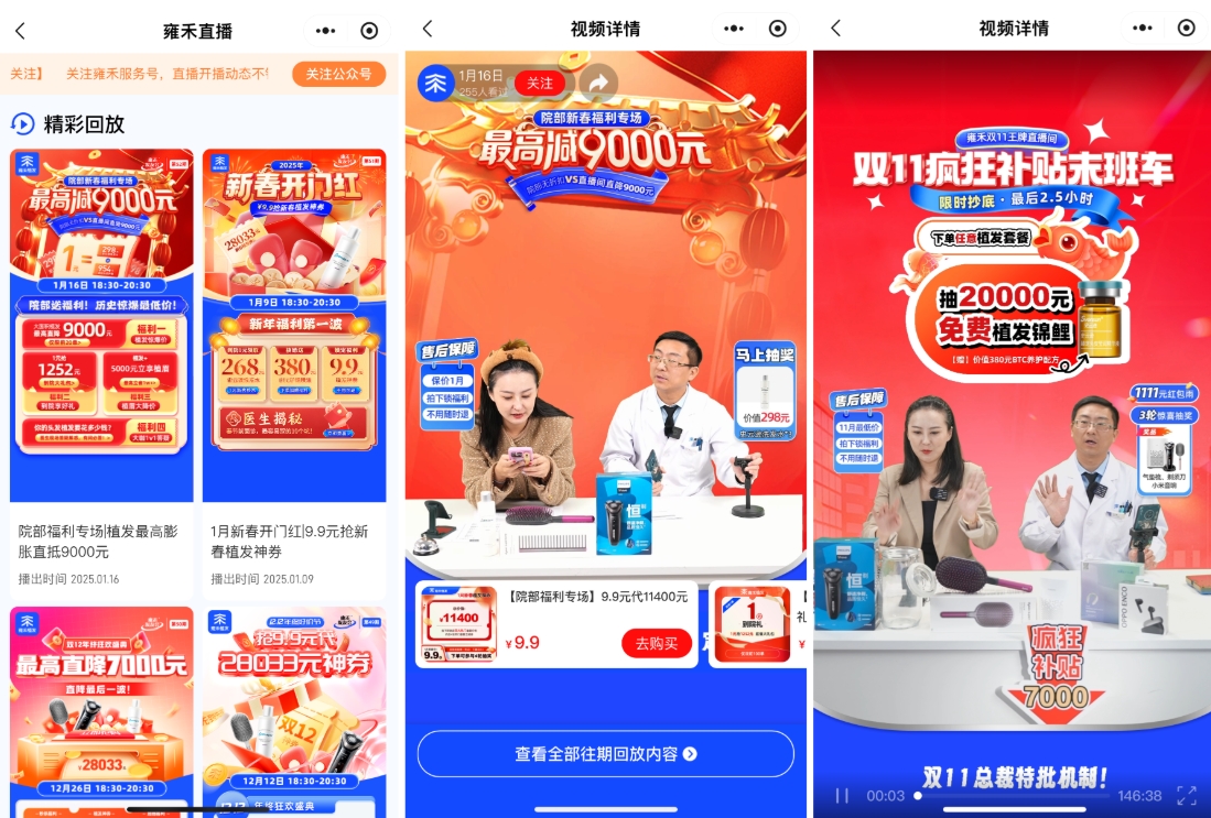 上图为国内知名植发品牌「雍和健康」小程序直播带货界面。