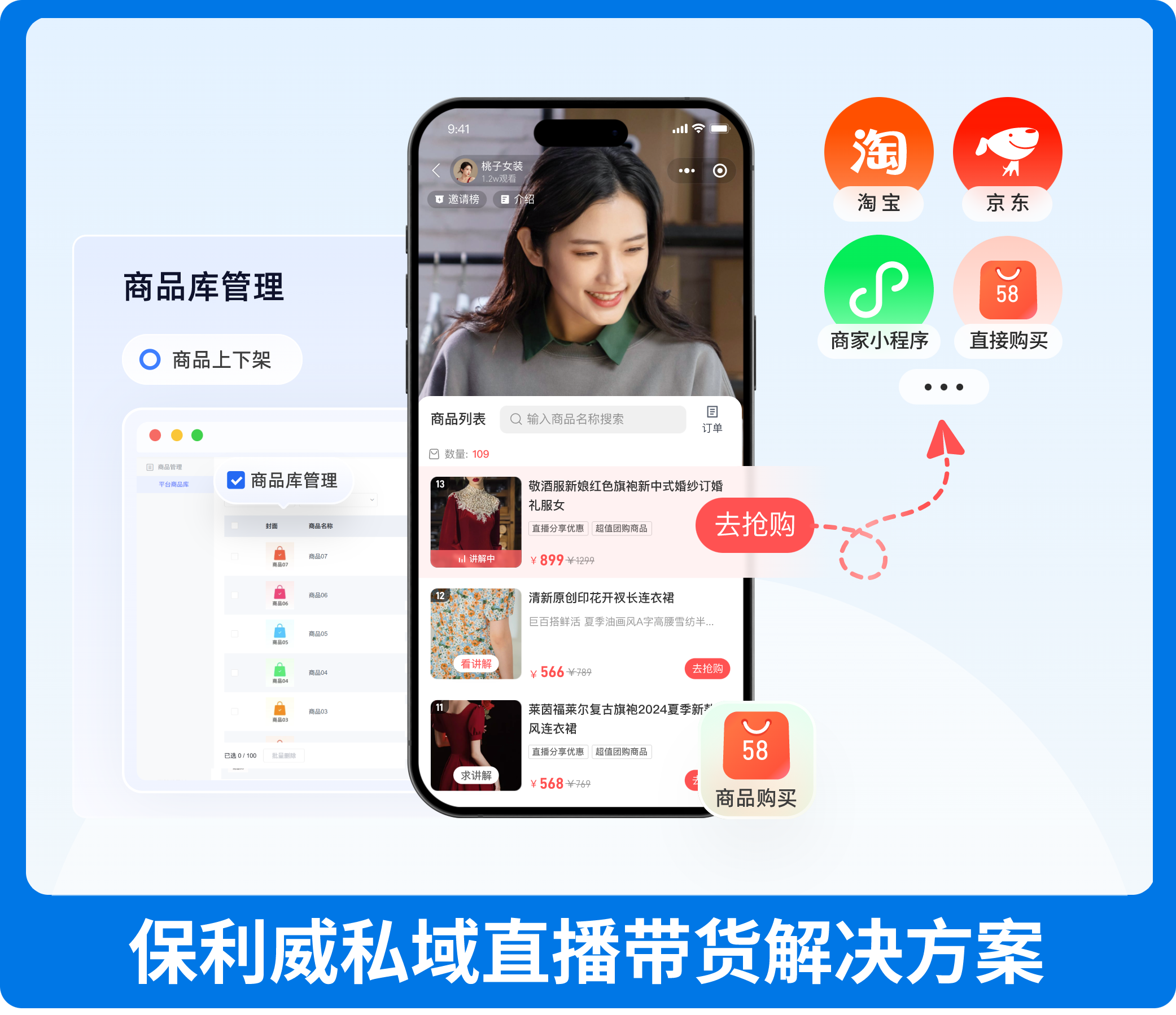 专为直播变现而做的私域商品库,支持商品上下架管理,支持直播间直接购买,页支持跳转小程序商城、网站等平台购买,总有一种方案适合你的业务需要!