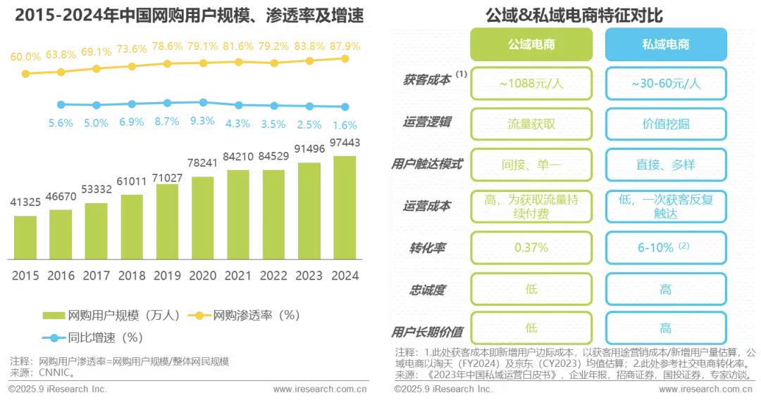 根据艾瑞咨询《2025年中国私域电商行业趋势白皮书》,2024年我国网购用户规模已达到9.7亿,网购渗透率逼近90%的关口,增长空间基本见顶。在此背景下,电商行业正从“抢增量”向“做存量”过渡。