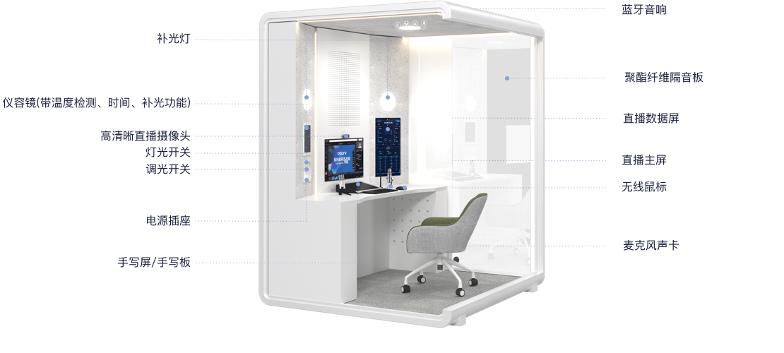 直播舱从硬件、装饰、灯光,都实现了标准化,方便后期维护和管理。讲师无需调试,入舱即可开播。