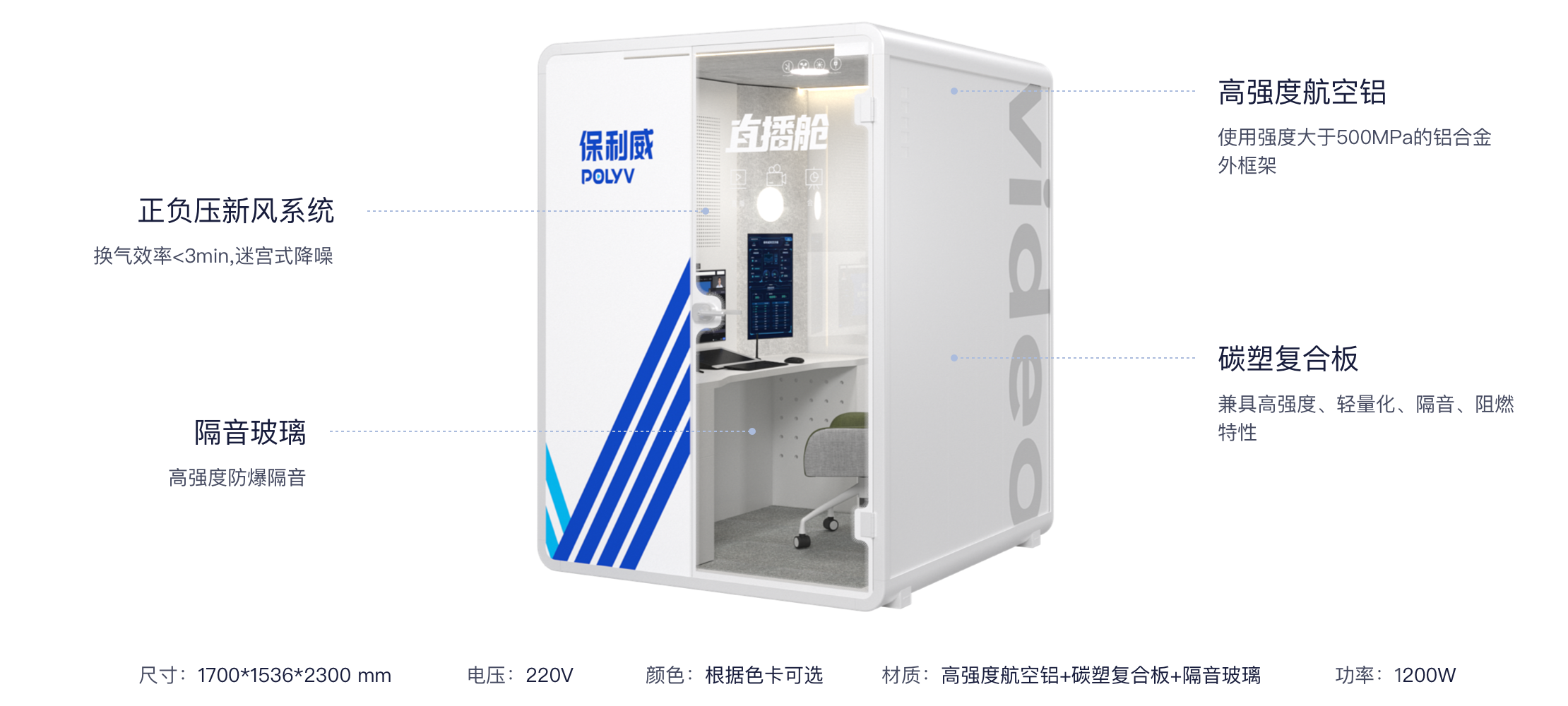 在保利威直播舱中,使用了增强隔音材料,柜体外可减少30dB噪音干扰,这个级别相当于客厅、安静的办公室,直播隐私能够得到很好保障,也不会干扰到外部。